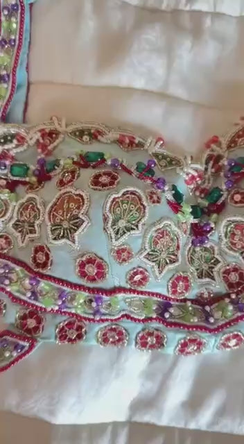- Choli: Heavy muslin cotton with digital print, real mirror work and fancy lace for sleeves (unstitched fabric, can be stitched to XXL+ size)