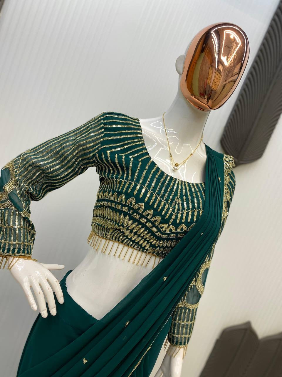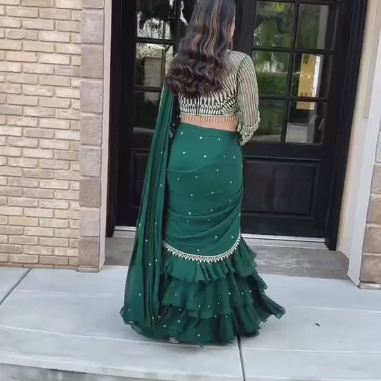 New ready to wear ruffle lehenga saree with full sleeve blouse featuring sequence embroidery work - Ready to dispatch with premium quality.