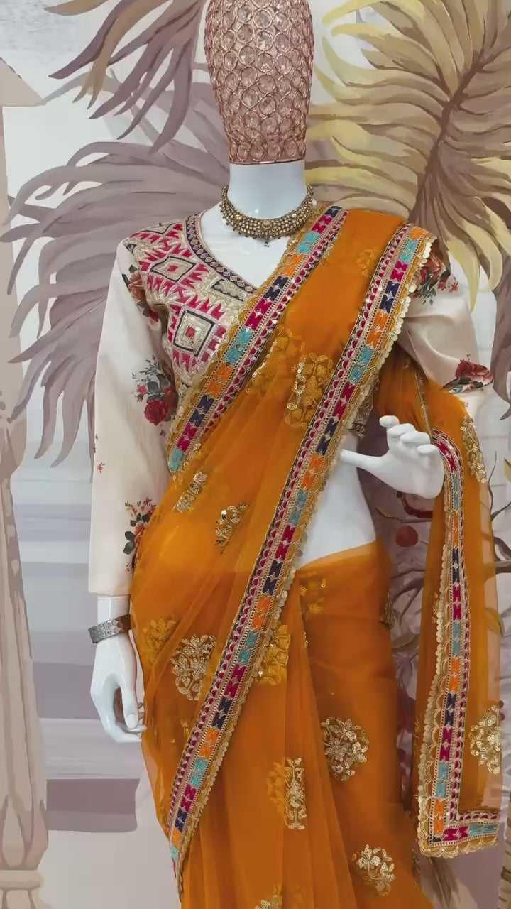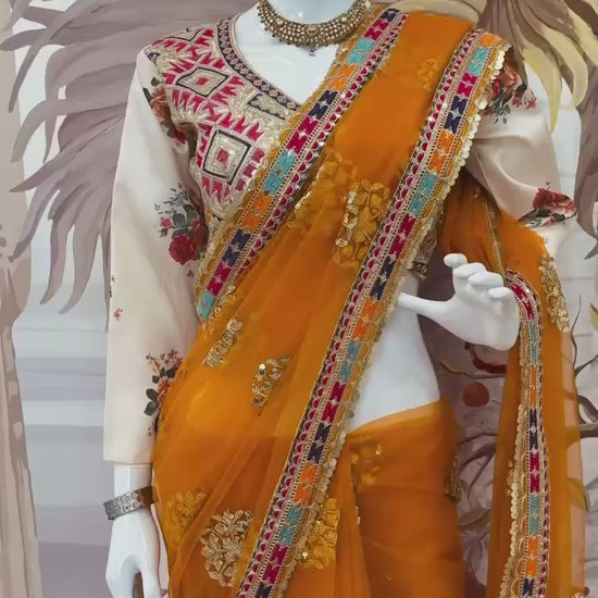 We are launching new superhit design on net fabric with heavy embroidery & fancy lace work saree with stitched blouse - Premium quality guaranteed.